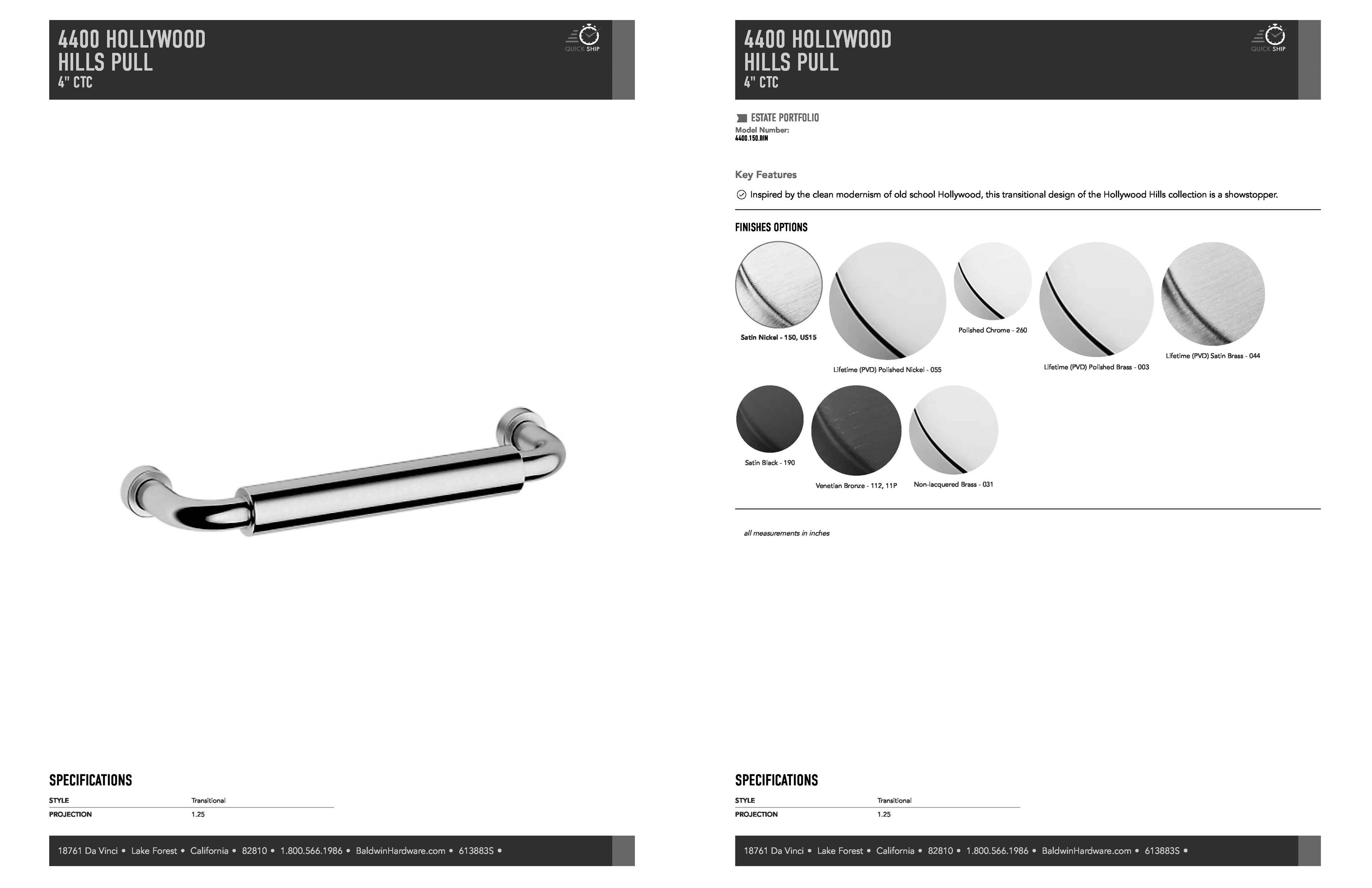 4400, Hollywood Hills Pull - 4" CTC x 1.25" p., BH Hollywood Hills Collection