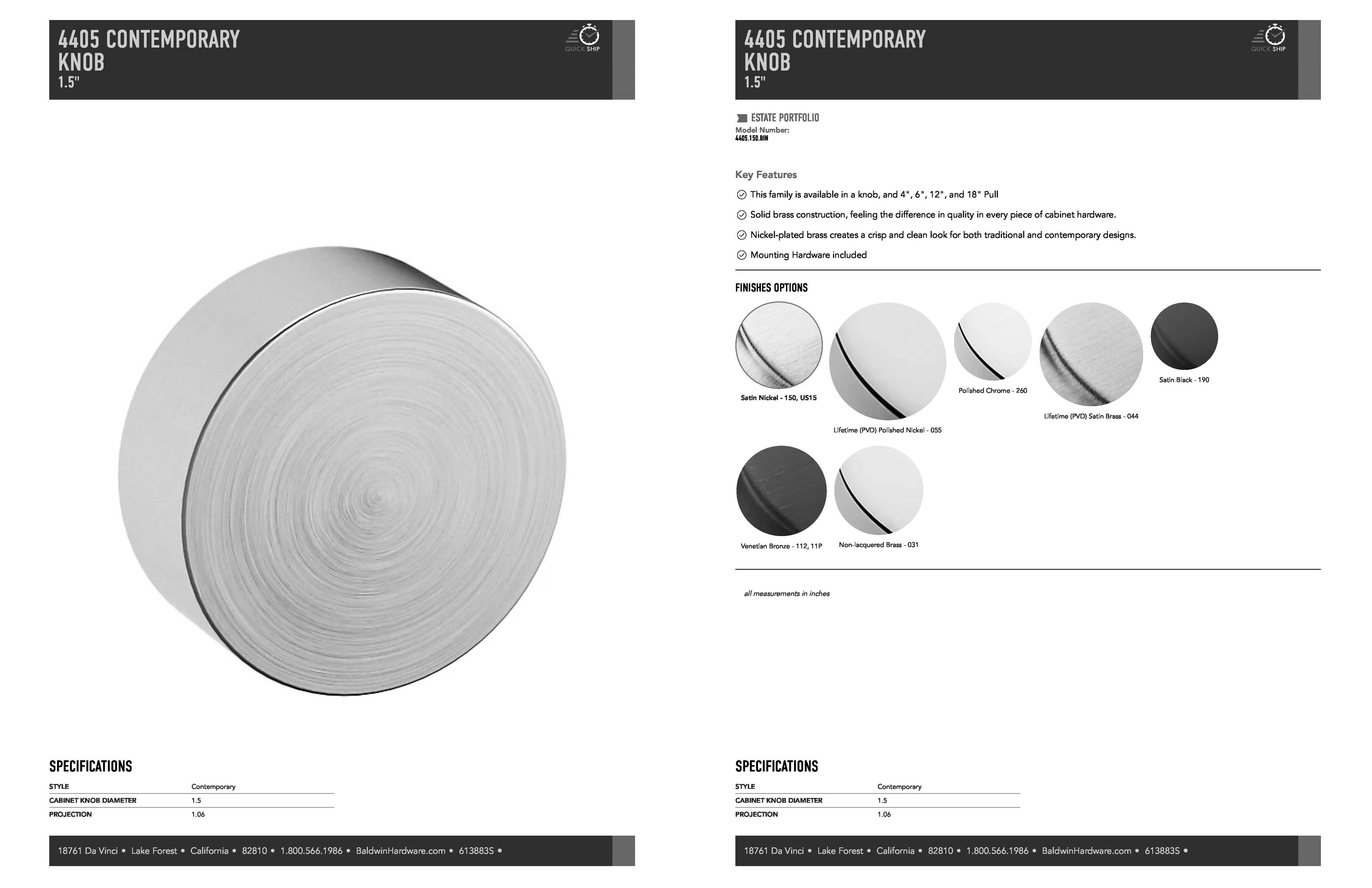 4405, Contemporary Knob - 1.5" d. x 1.06" p., BH