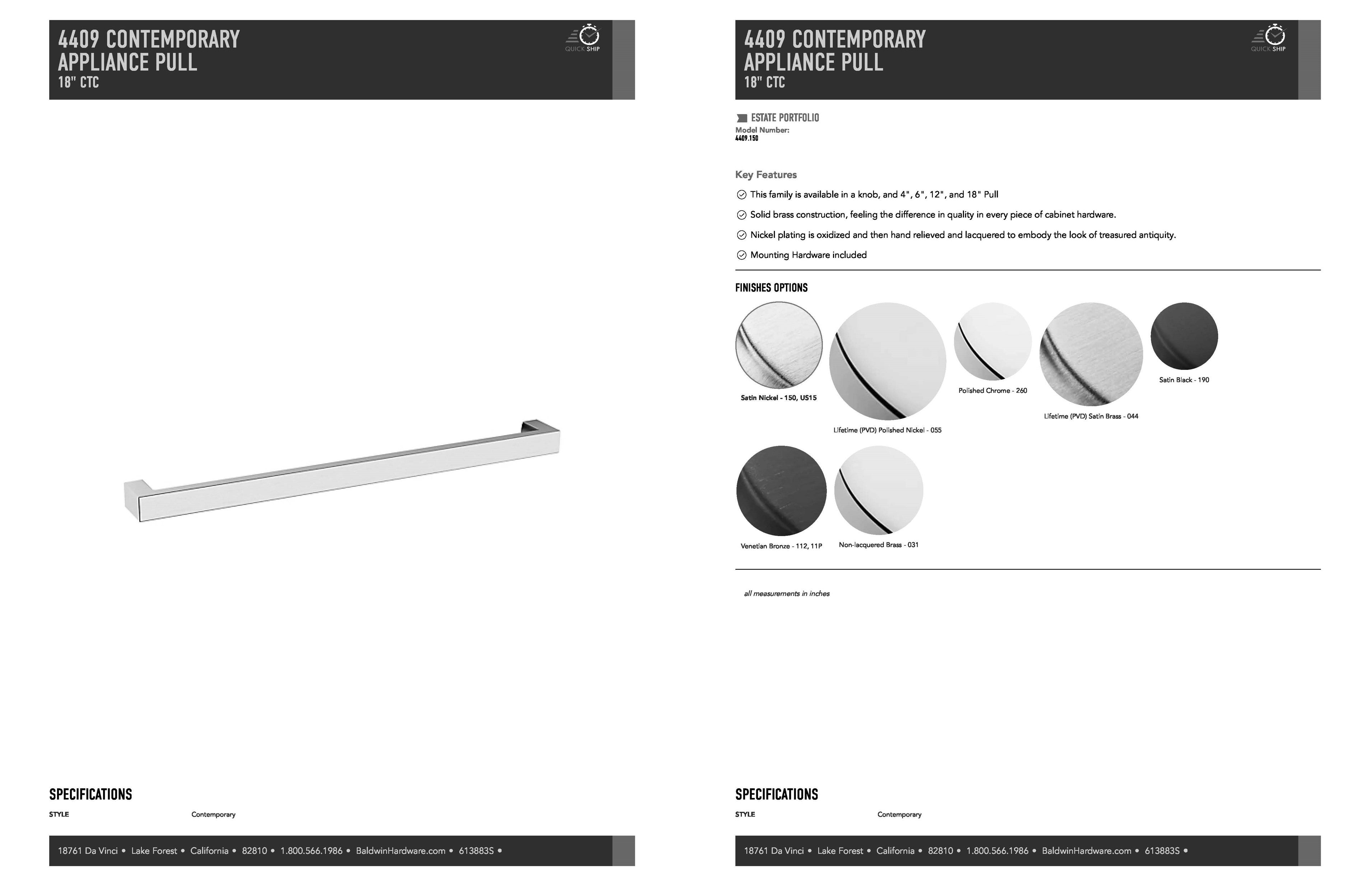 4409, Contemporary Appliance Pull - 18" CTC, BH