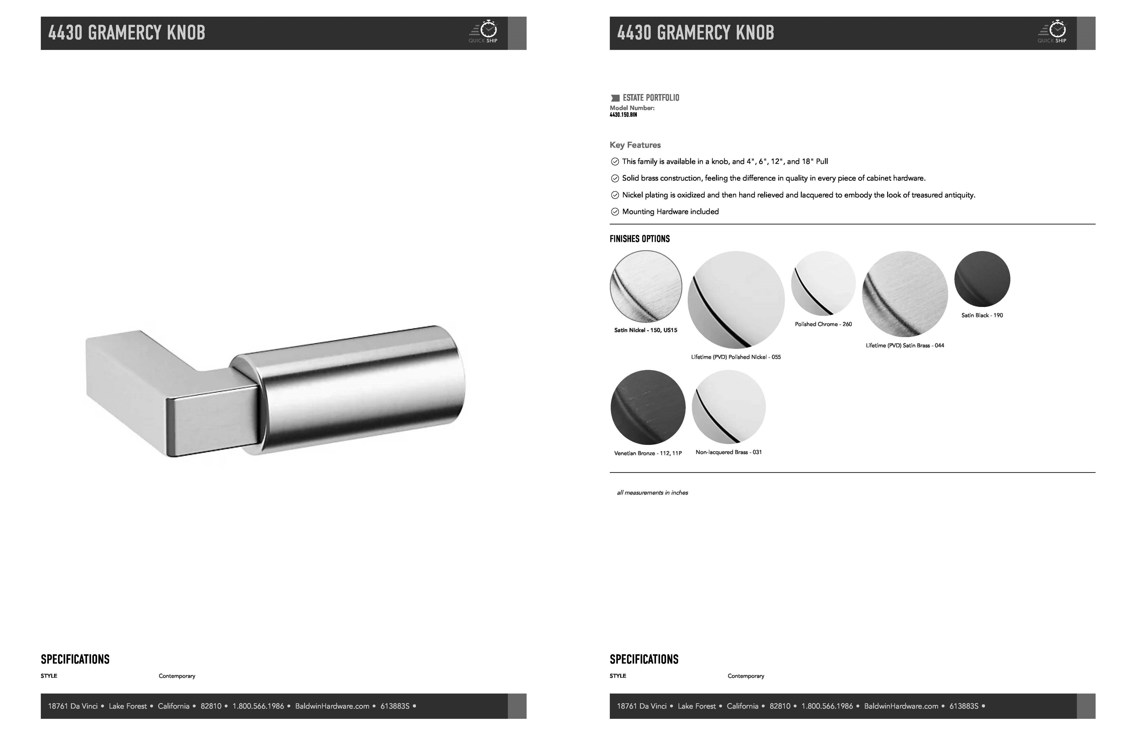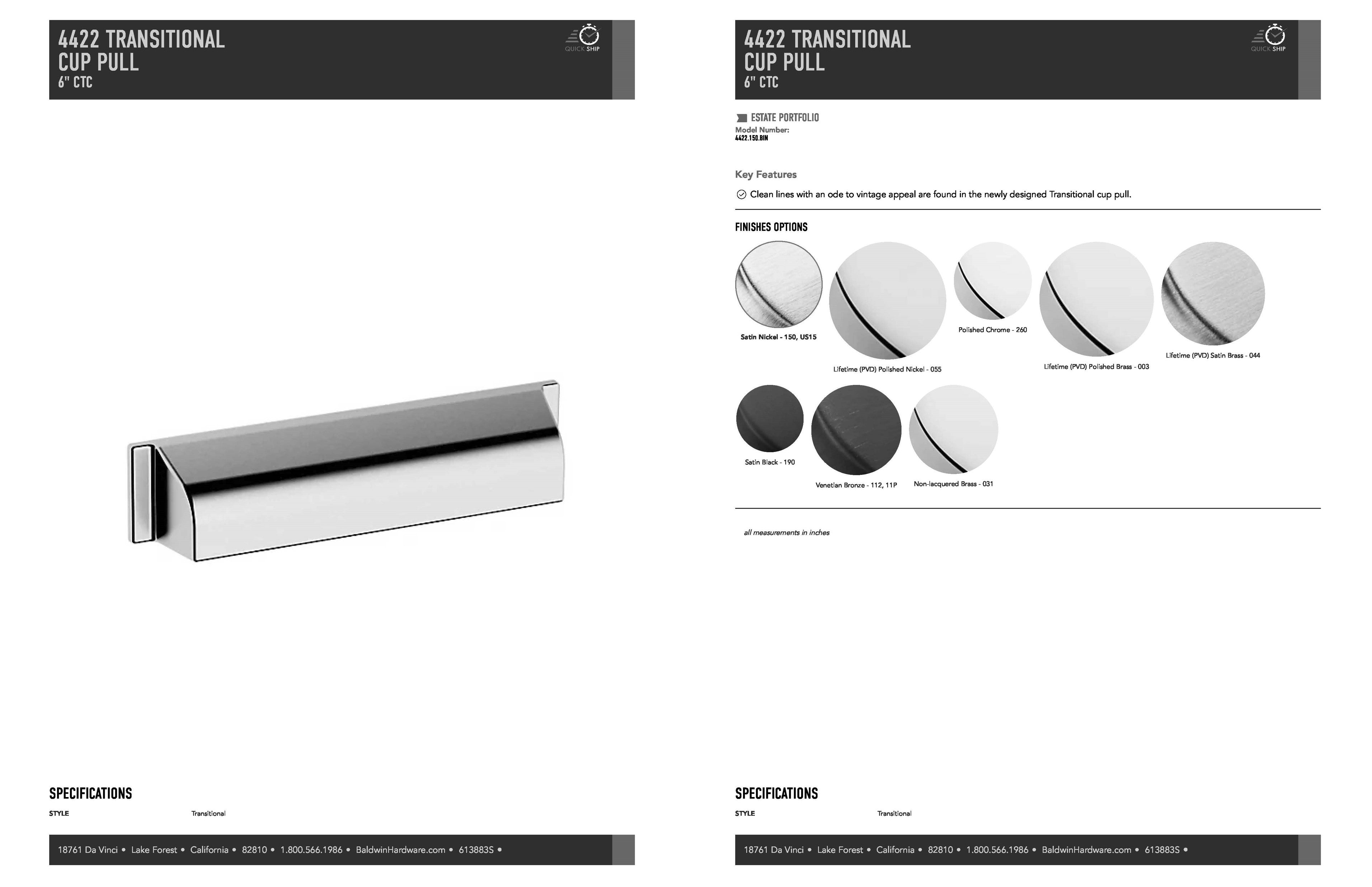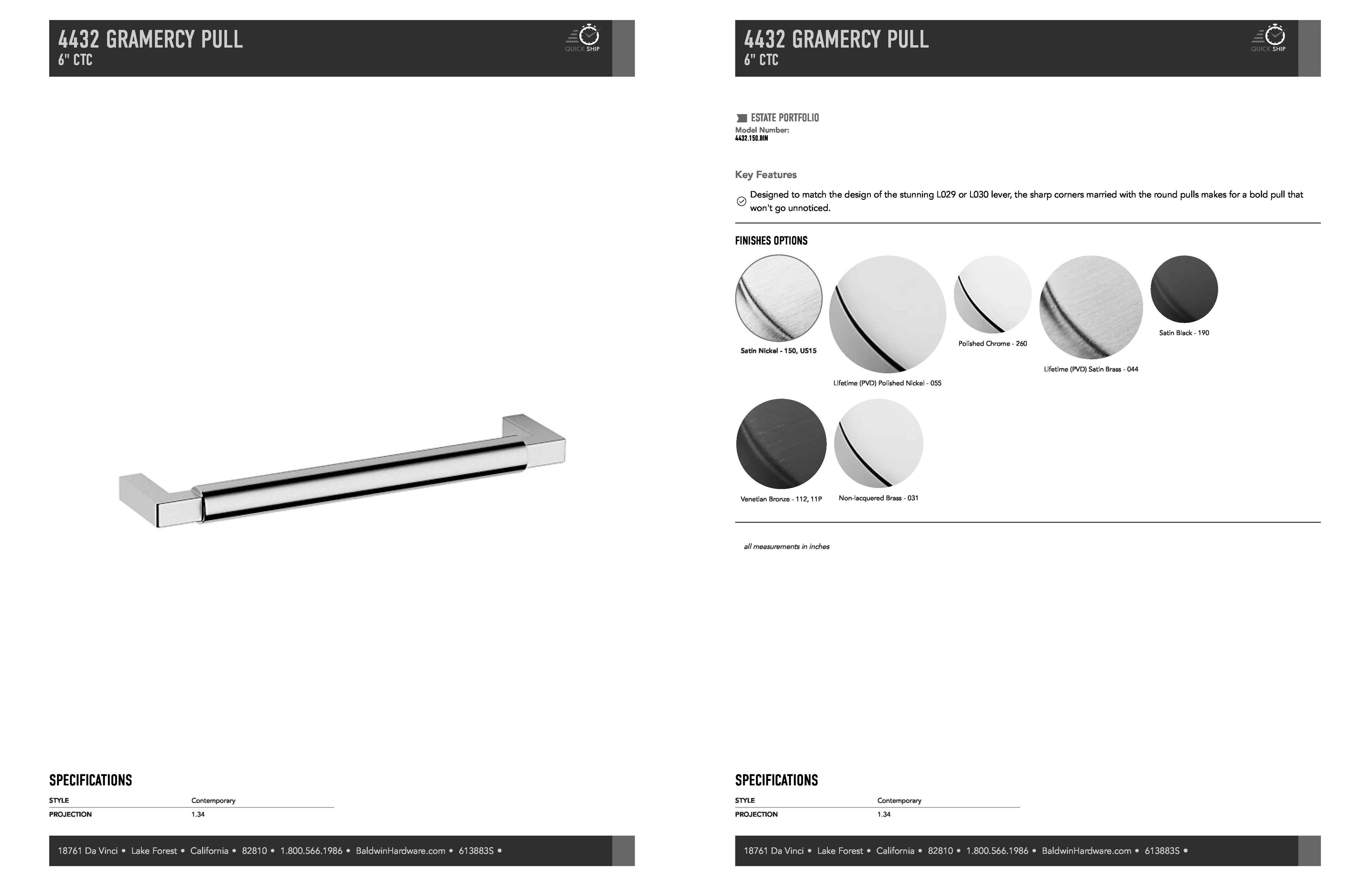 4432, Gramercy Pull - 6" CTC x 1.34" p., BH Gramercy Collection