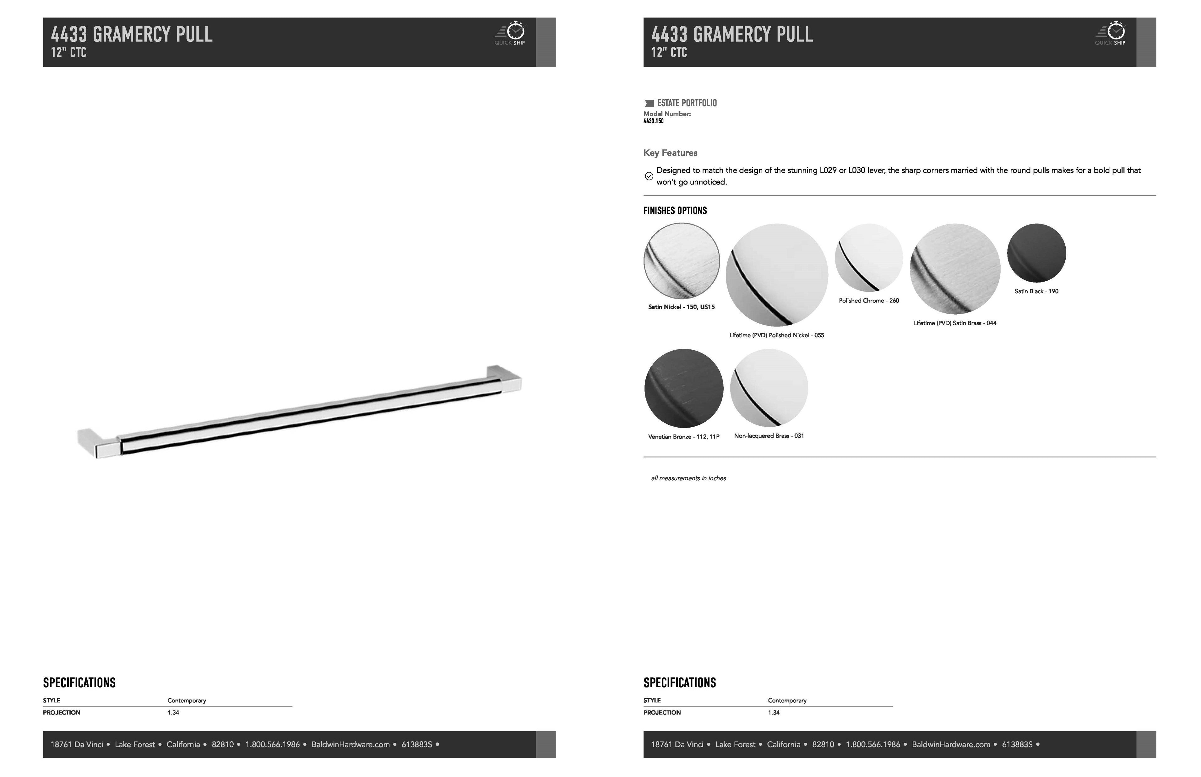 4433, Gramercy Pull - 12" CTC x 1.34" p., BH Gramercy Collection