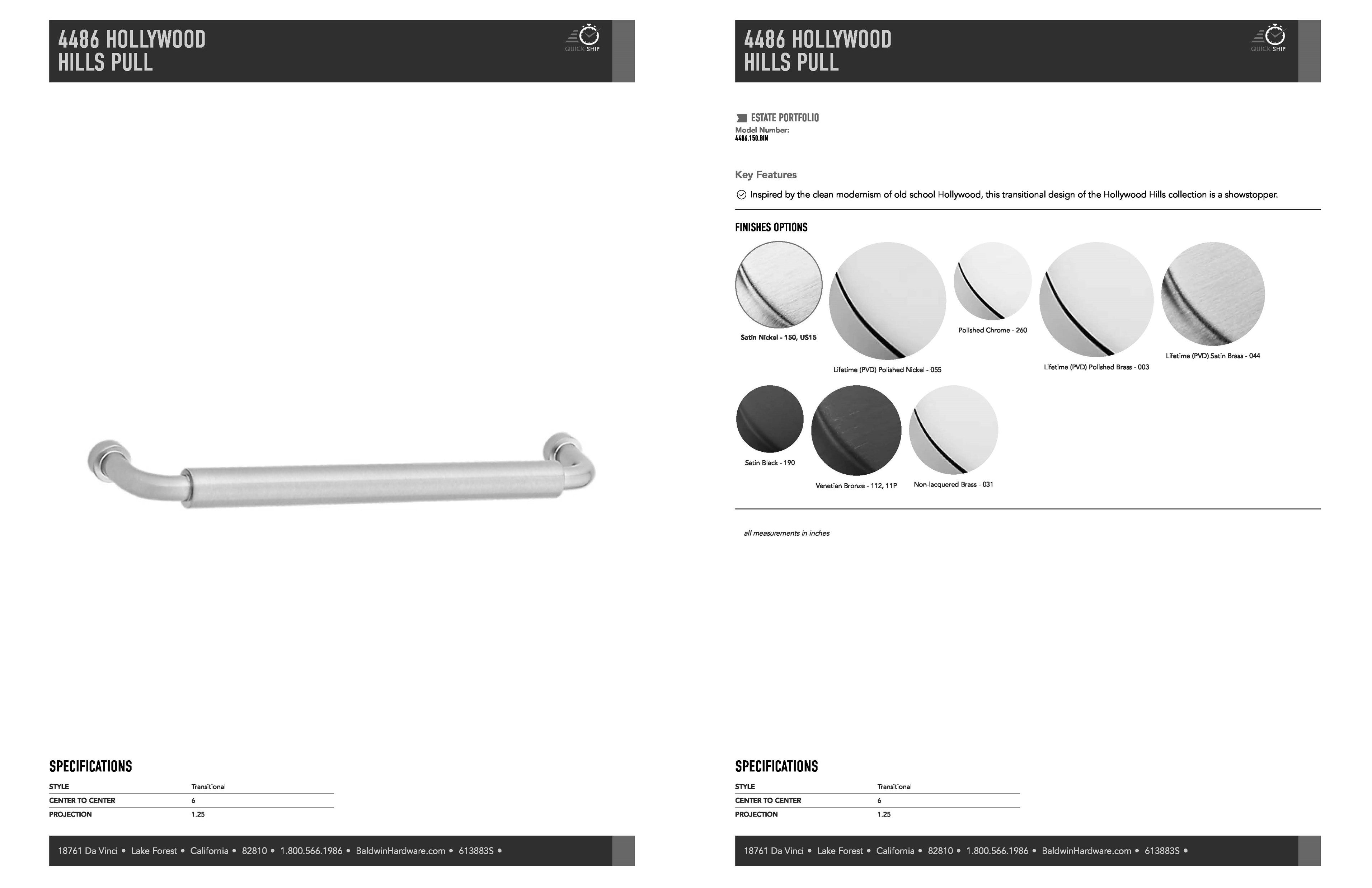4486, Hollywood Hills Pull - 6" CTC x 1.25" p., BH Hollywood Hills Collection