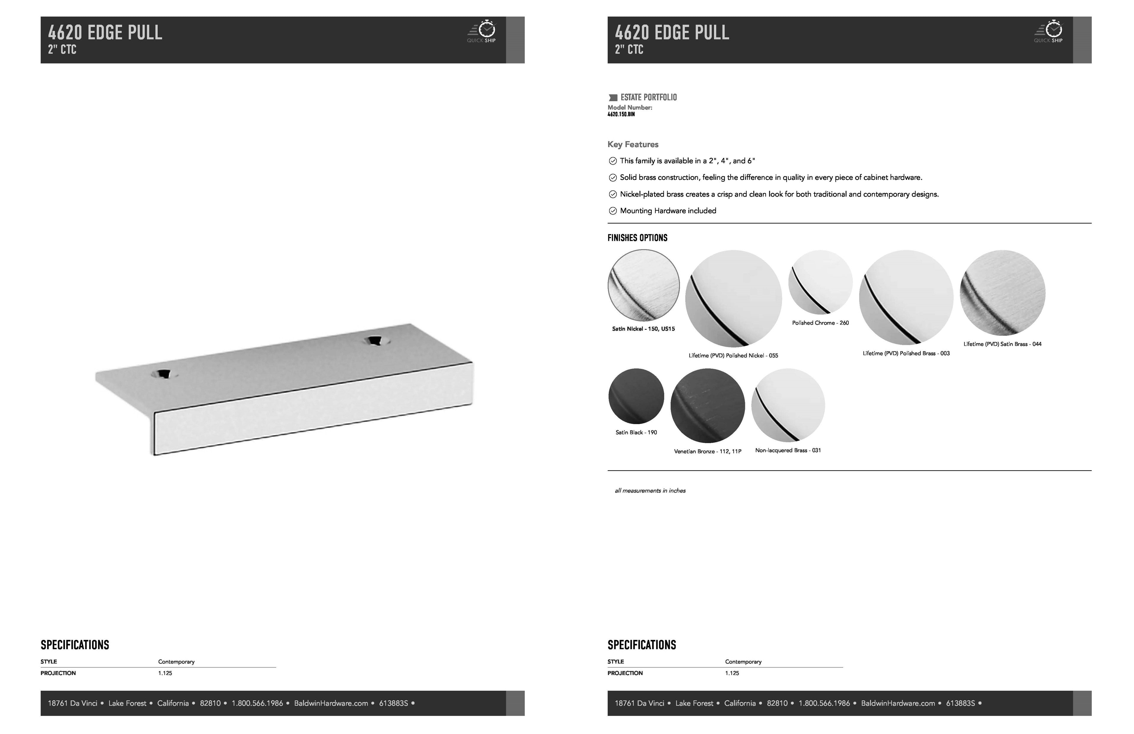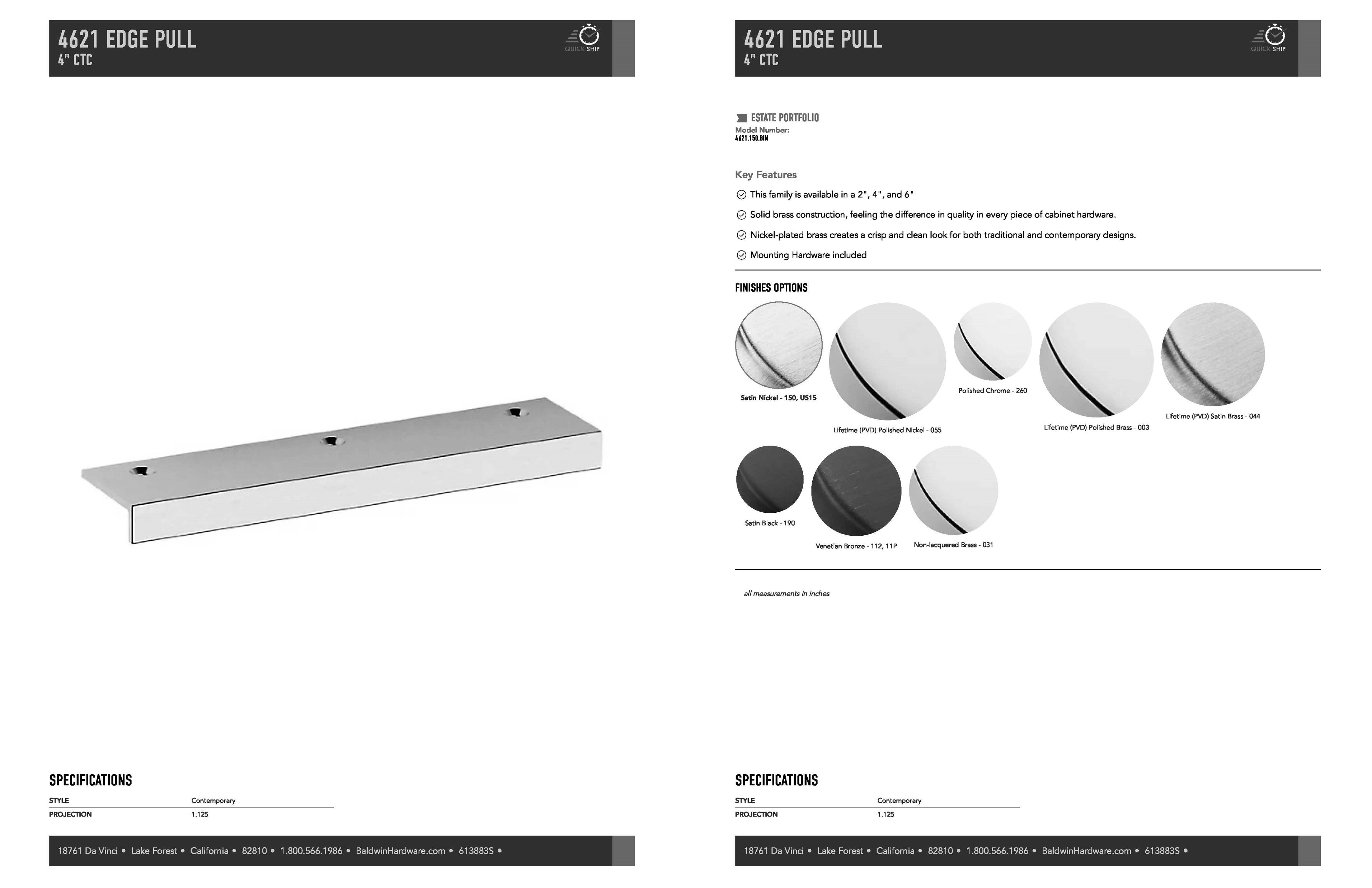 4621, Edge Pull - 4" CTC x 1.125" p., BH Edge Pulls