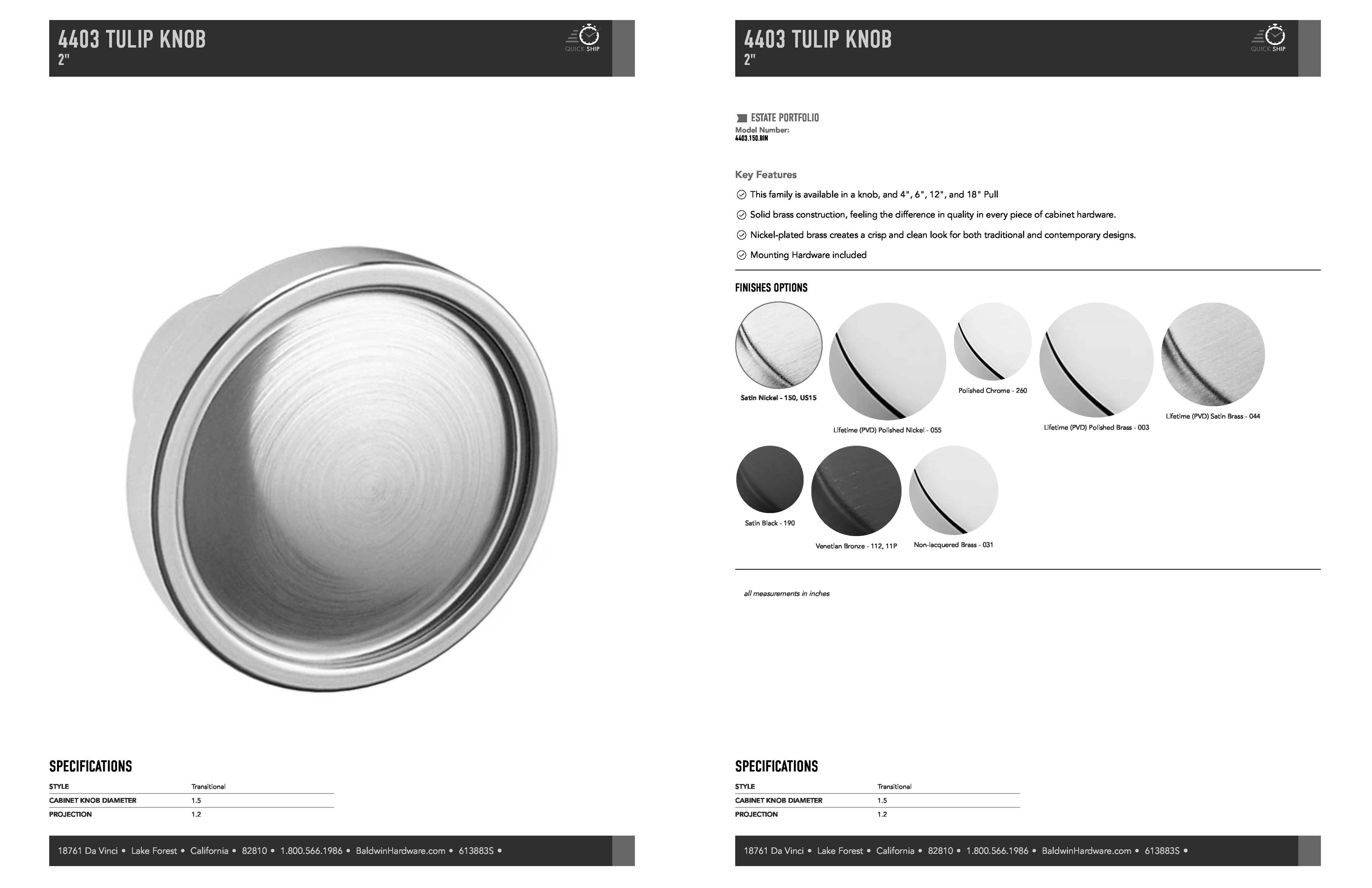 Tulip Collection | Style: Modern | Category: Cabinet | Sub Category: Knob | Material: Brass | Size: 1.5"d. x 1.2" p. | Made in USA | Usually Ships 2-3 Weeks