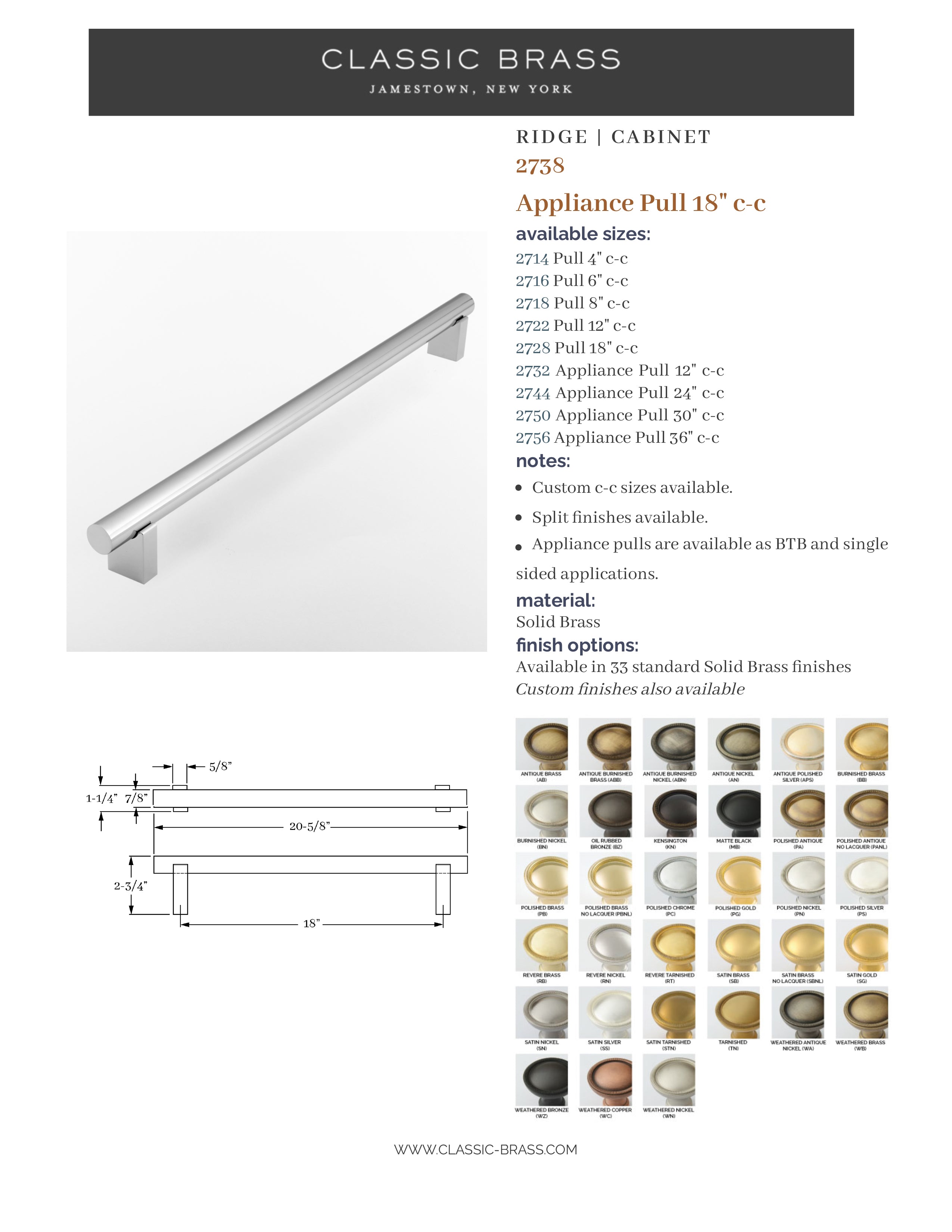 Ridge Collection| Style: Modern | Category: Cabinet | Sub Category: Pull - Appliance | Material: Brass | Size: 18" c-c | Made in USA | Usual Ship Time