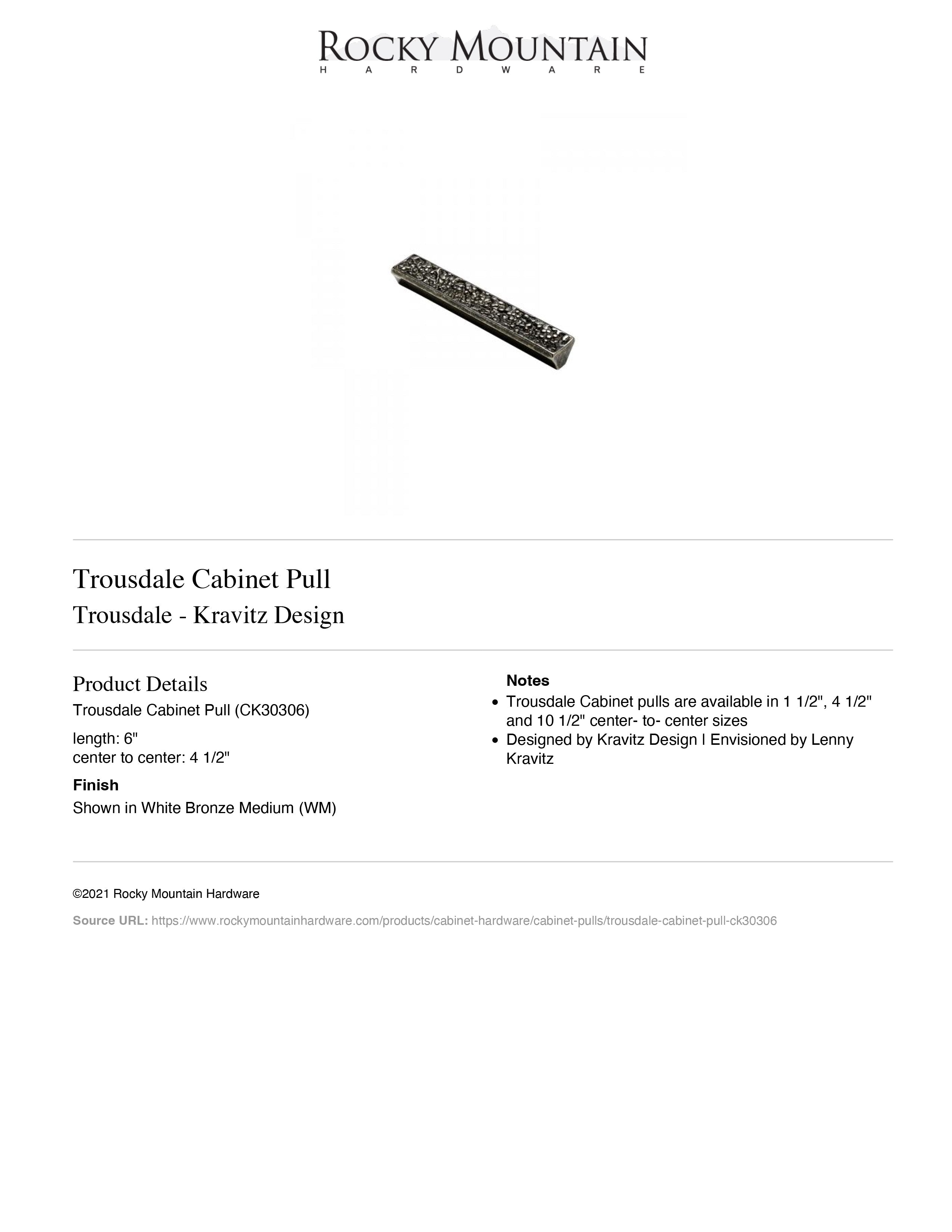Kravitz Design Collection| Style: Rustic | Category: Cabinet | Sub Category: Pull | Material: Bronze | Size: 4-1/2" c-c | Usually ships: 8-10 weeks | Made in USA